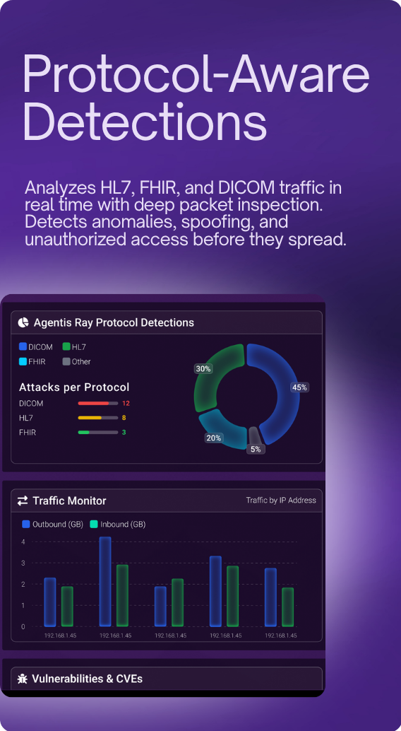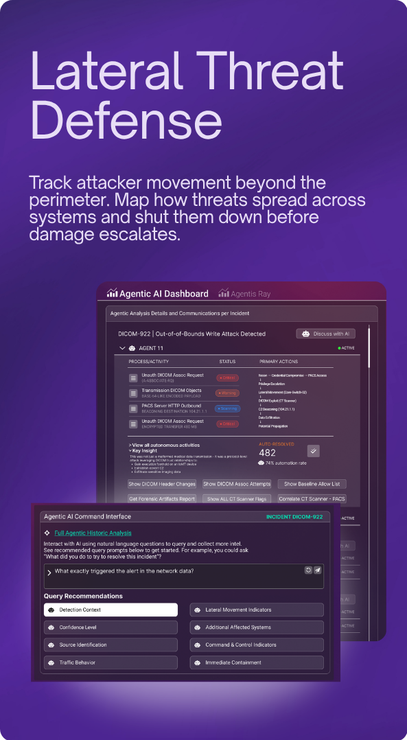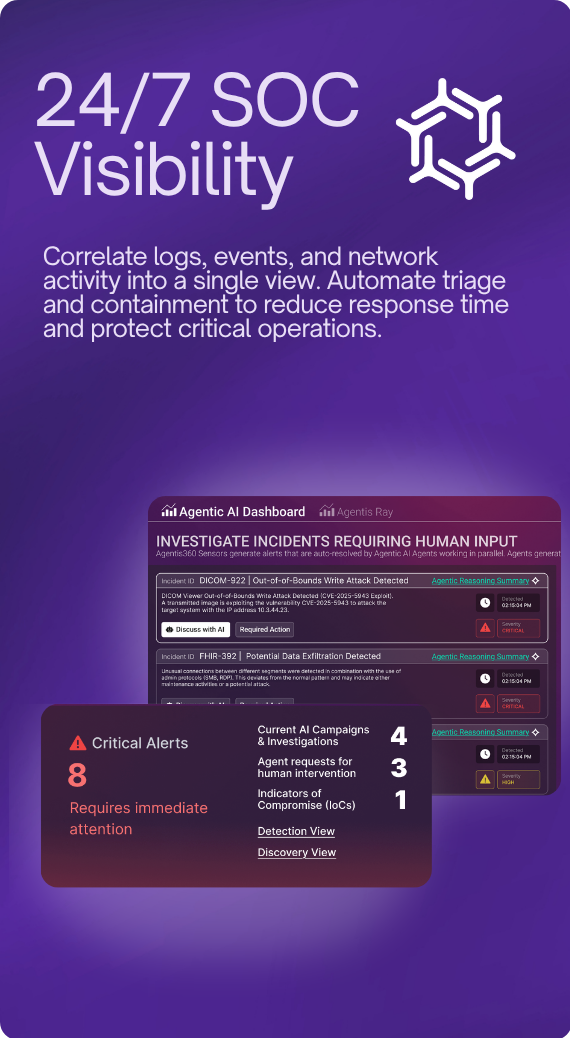 agentis360 is an AI-powered solution that defends critical healthcare infrastructure, medical devices, networks, and data by preventing and resolving both known and unknown threats.